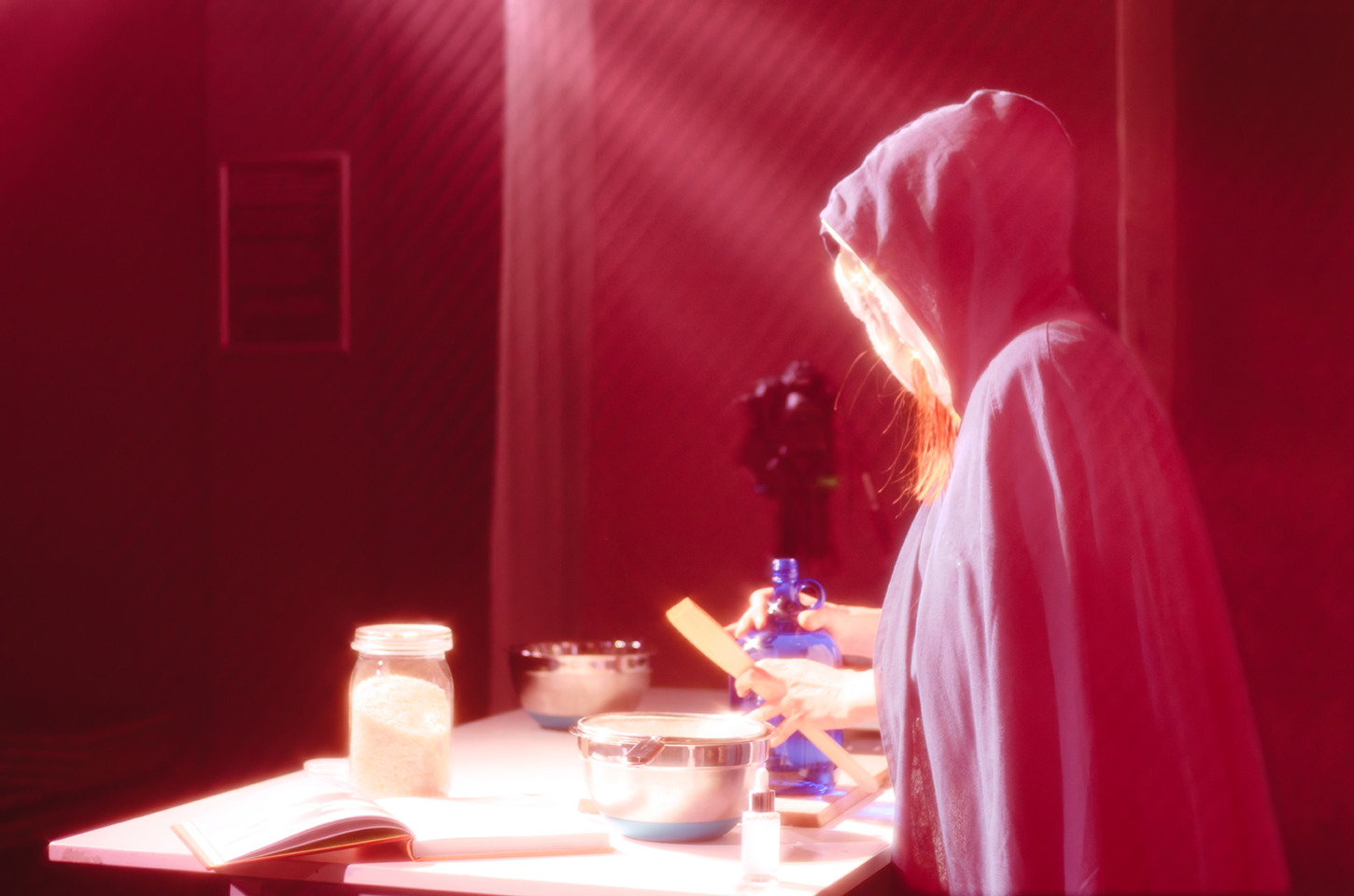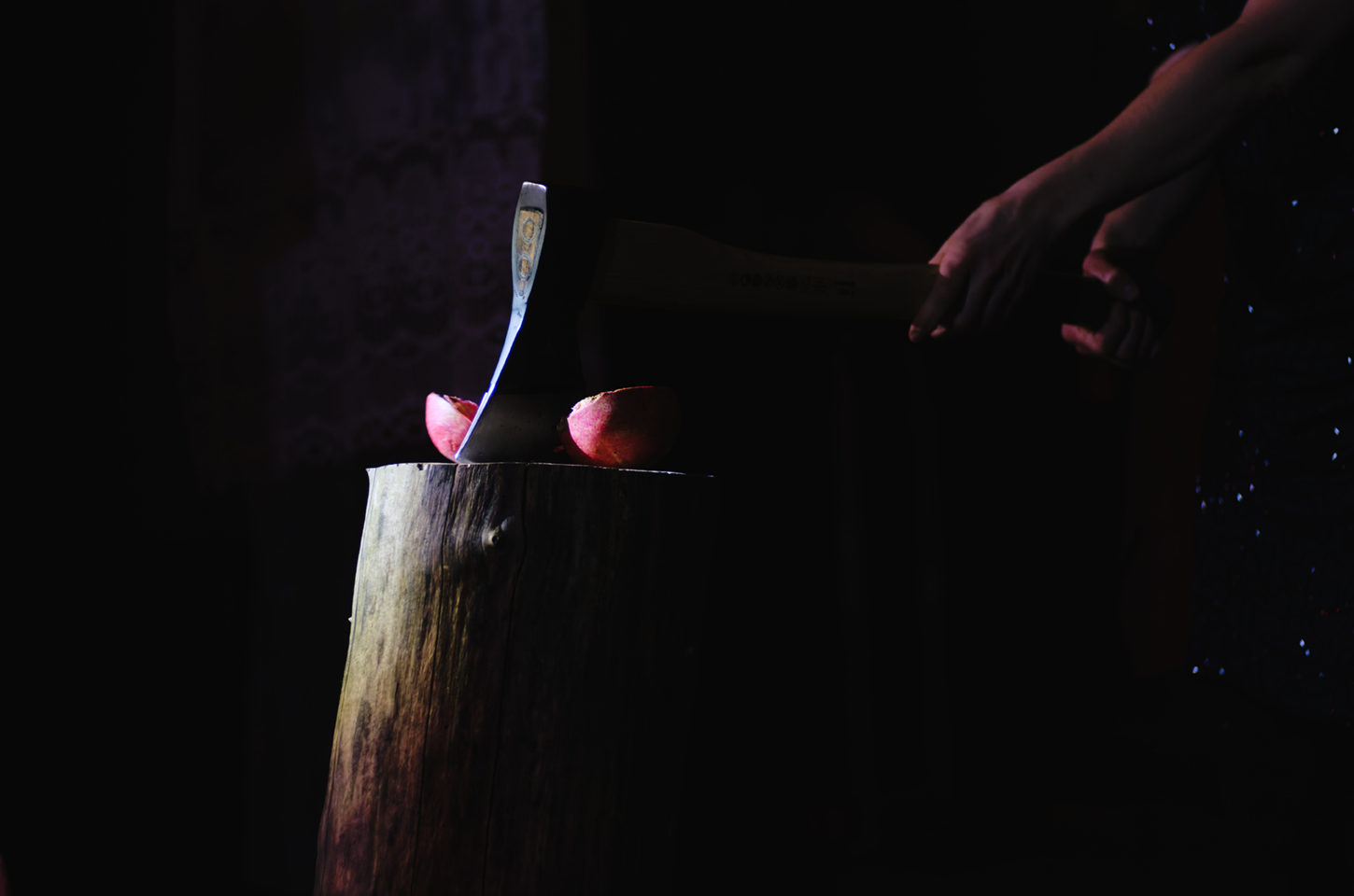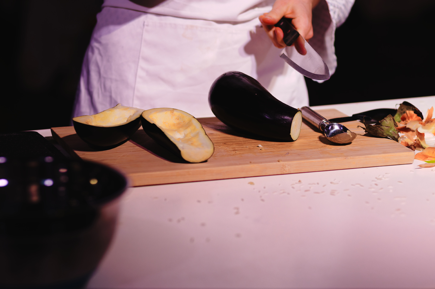 Die Zwiebel wehrt sich mit ätherischem Öl, doch es hilft nichts. Sie zischt in der glühend heißen Pfanne. Die Aubergine schreit stumm, als der Schaber sie durchfährt. Ein Schmerz der sich jeder sprachlichen Beschreibung widersetzt, ein dumpfes Kratzen, die Entleerung fällt ins Bodenlose. Das Wasser sprudelt und verdampft die Tränen in die Atmosphäre. Eine Auflösung, Erleichterung, Schwerelosigkeit? Am Ende schmeckt es bitter-sweet.